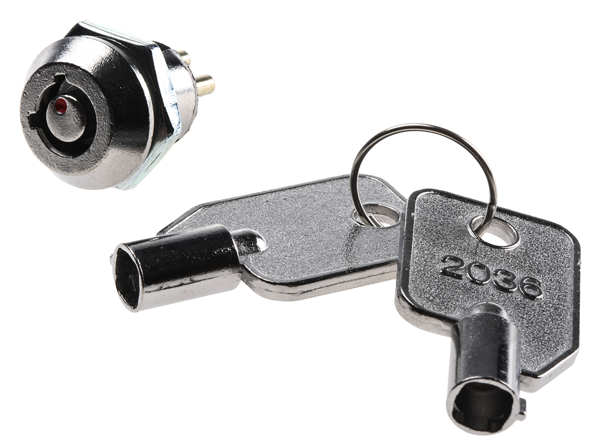 The Lorlin LS121 key switch is an electromechanical 2-way key-operated switch that provides switching solutions for various settings. This compact switch is equipped with anti-tamper locking and is manufactured from zinc alloy (chrome-plated) casing material. It also allows easy key removal options from dual positions with an index angle of 90°. The tubular Lorlin switch has a round bezel with an ON/OFF switch operation. The silver-plated contacts are also DPST and have a current rating of 4 A @ 125 V ac. The typical operating temperatures include -20°C and 55°C and are RoHS-compliant. In addition, the LS121 key switch has 2-way applications in control panels, electromechanical operation, and alarms.
