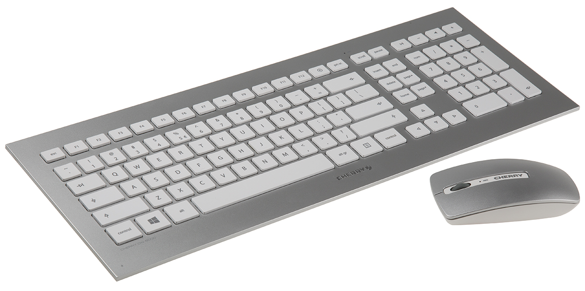 This is Cherry Silver Silver/White Wireless QWERTZ Keyboard and Mouse Set manufactured by CHERRY. The manufacturer part number is JD-0310EU. It contains a/an qwerty layout keyboard . It includes a built-in USB hub no . A wireless keyboard is included . Additionally, it has a 441 x 165 x 18mm of keyboard dimensions . Moreover, it has 103 normal keys . It has a wireless mouse included . It has a decent silver colour. It has multimedia keys 5 . It has 165mm keyboard depth . It contains a/an standard type keyboard . Moreover, it has a/an optical mouse tracking method . It has a keyboard of 18mm in height . It has a model dw 8000. It has 3 mouse buttons . With a standard 441mm of keyboard width .