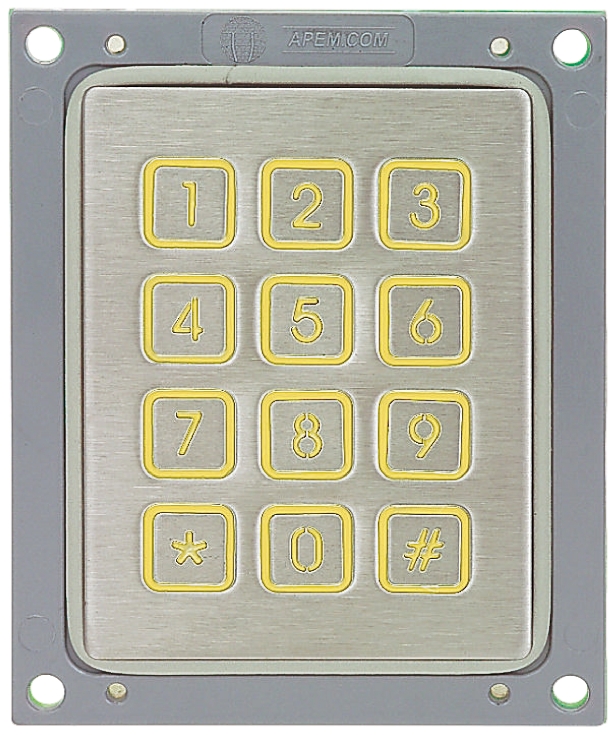 This is IP65 12 Key Stainless Steel Keypad manufactured by Apem. The manufacturer part number is T8P0120017050. The total number of keys are 12. It has 1000000 mechanical life per key . It is IP rated with ip65. The product has -20 → +70°c of operating temperature range. It has about 4 x 3 layout keypad . Typical depth of 10mm behind panel. Whereas, the minimum operating temperature of the product is -20°c. It has a maximum operating temperature of +70°c. The actuator is designed from sturdy stainless steel material.