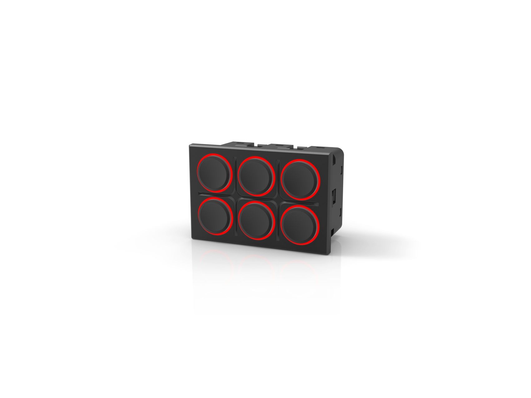 This is 6 Key Illuminated Keypad manufactured by EAO. The manufacturer part number is K09-01.000002. The total number of keys are 6. Illumination Option yes. It has about 2 x 3 layout keypad .