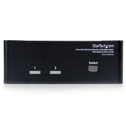 This is 2 Port Dual Monitor DVI KVM Switch manufactured by Startech. The manufacturer part number is SV231DDVDUA. The given dimensions of the product include 163 x 100 x 57mm. This product features 2 number of ports. It has an attractive dvi type video connection . It supports 2 displays . It exhibits a maximum 1920 x 1200 resolution . In addition, the height is 57mm. Furthermore, the product is 163mm wide. The product comes in 100mm depth. In addition, it includes 2 video output(s) . It has a usb type keyboard/mouse connection . It has a/an 3.5 mm stereo type audio connection .