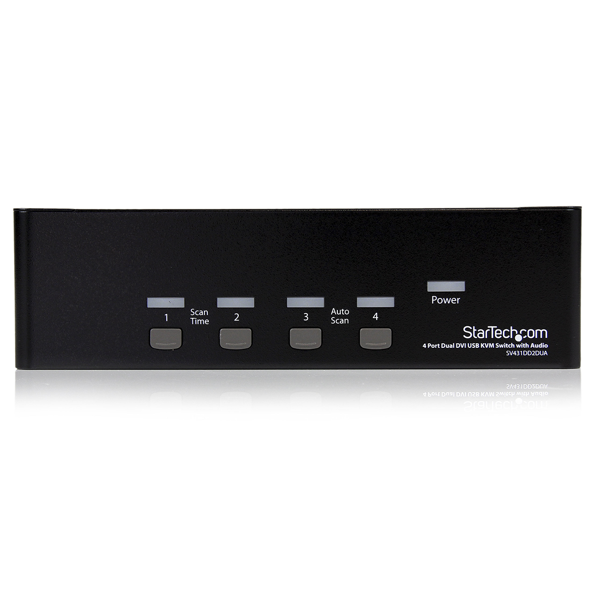 This is 4 Port Dual Monitor USB DVI KVM Switch - 3.5 mm Stereo manufactured by StarTech.com. The manufacturer part number is SV431DD2DUA. The given dimensions of the product include 220 x 130 x 60mm. This product features 4 number of ports. It has an attractive dvi type video connection . It supports 2 displays . It exhibits a maximum 1920 x 1200 resolution . In addition, the height is 60mm. Furthermore, the product is 220mm wide. The product comes in 130mm depth. In addition, it includes 2 video output(s) . It has a usb type keyboard/mouse connection . It has a/an 3.5 mm stereo type audio connection .