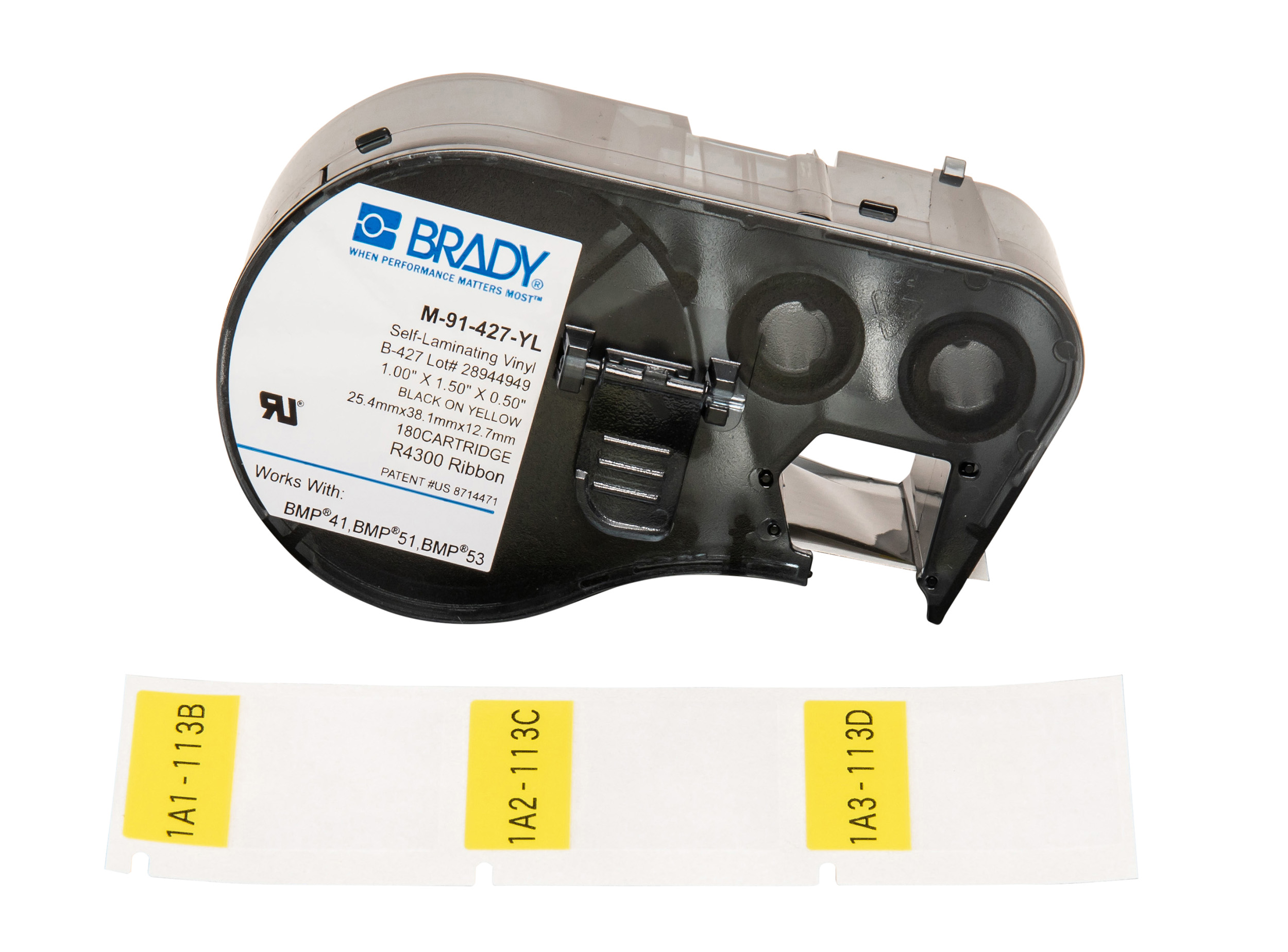 This is B-427 Cable Label For Use With BMP41 Label Printer BMP51 Label Printer BMP53 Label Printer manufactured by Brady. The manufacturer part number is M-91-427-YL. It is designed with an attractive yellow/transparent colour background . In addition, it has a standard label about 38.1mm in length . The product b-427 self-laminating vinyl, is a highly preferred choice for users. The product is made from highly stable and reliable vinyl. Its tape is about 25.4 mm in width . Its label quantity is 180 . It offers an adorable black colour print . Additionally, it works with bmp41, bmp51, bmp53 printer models .