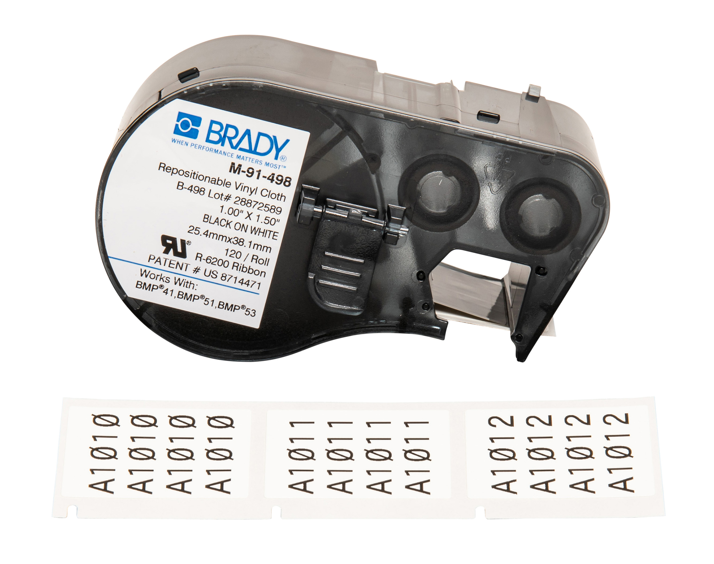 This is Cable Label For Use With BMP41 Label Printer BMP51 Label Printer BMP53 Label Printer manufactured by Brady. The manufacturer part number is M-91-498. It is designed with an attractive white colour background . In addition, it has a standard label about 38.1mm in length . The product b-498 repositionable vinyl, is a highly preferred choice for users. Its tape is about 25.4 mm in width . It offers an adorable black colour print . Additionally, it works with bmp41, bmp51, bmp53 printer models .
