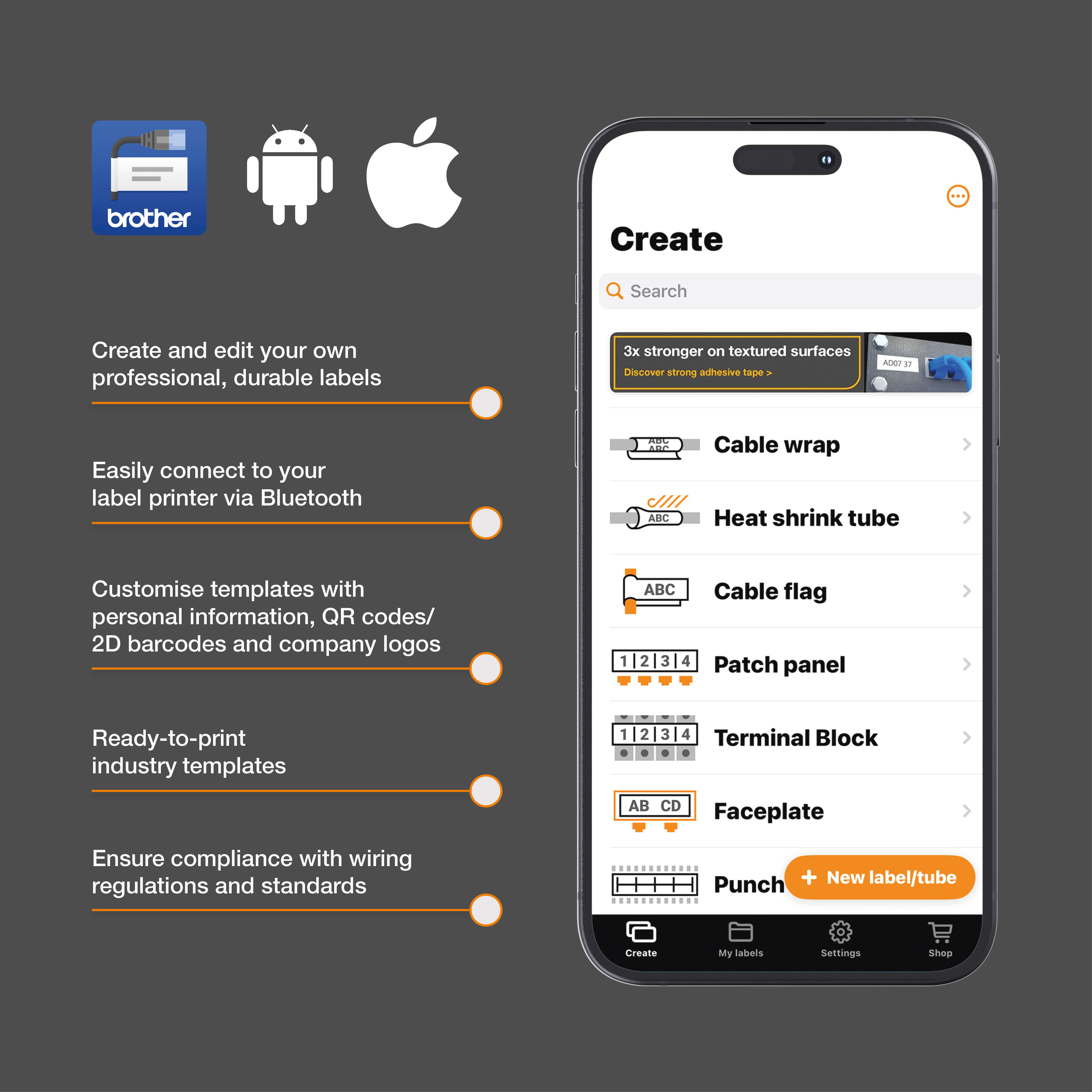 The Brother Pro Labelling Machine provides a professional labelling solution for electrical and datacom installations, ensuring clear identification of cables, conduits, switches, and sockets with durable labels. Designed for electricians, datacom technicians, telecom professionals, and security equipment installers, this machine features built-in industry-specific functions and one-touch application keys for easy operation. Large backlit graphic display Prints durable labels up to 18mm wide Print speeds of up to 20mm/sec and built-in industrial strength cutter with cut/pause to help reduce waste 6x one-touch application keys for general, faceplate, cable flag/wrap, punch down block and patch panel identification Print labels containing QR code/2D barcode and logos