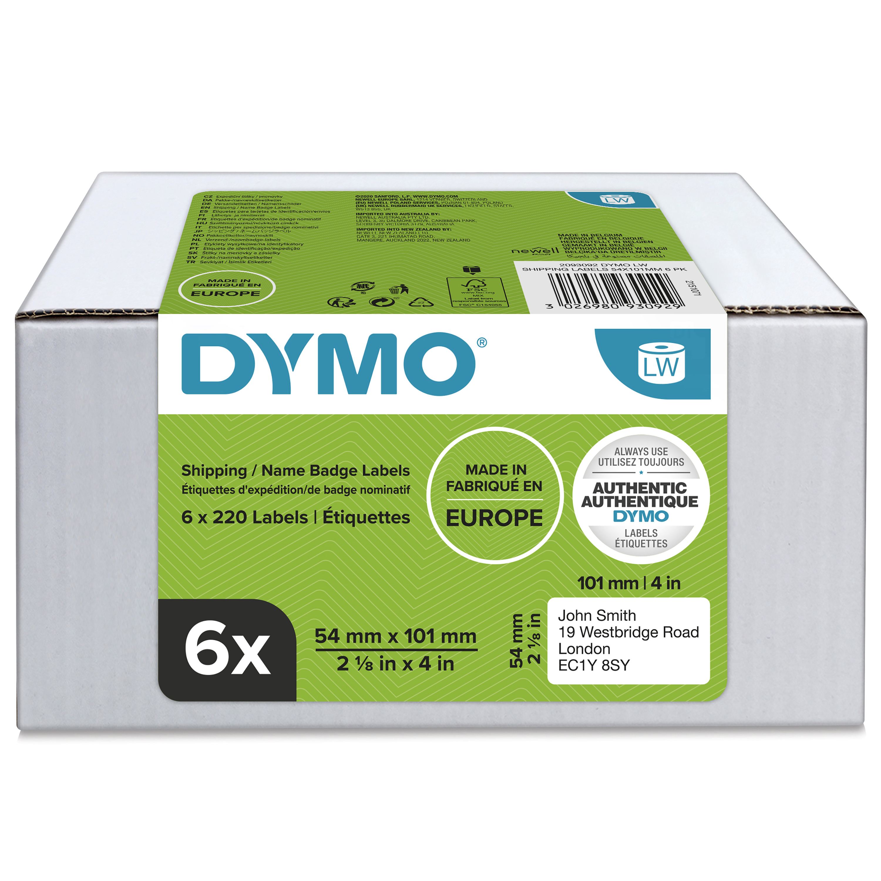 This is Printer Labels 101x54mm -Shipping Pk 6 manufactured by Dymo. The manufacturer part number is 2093092. It is designed with an attractive white colour background . Better World Verification Options - fsc certified. Is it a better world product? yes. Additionally, it works with dymo 450, dymo 450 duo, dymo 450 turbo, dymo 450 twin turbo, dymo 4xl, dymo wireless printer models . Its label dimensions are 54 x 101mm . Its label is 101mm in width . Its label is specifically 54mm in height .