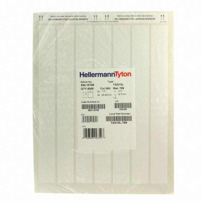 This is manufactured by HellermannTyton. The manufacturer part number is TAG15L-789. It is assigned with possible HTSUS value of 3926.90.9985. The product is rohs3 compliant. The product's body is manufactured from highly durable polyester (pet) materials. The product is highly reliable with a long-lasting period of 24 months. The background colour is white. In addition, it is reach unaffected. It is shipped in 5000 per pkg package . Its typical moisture sensitivity level is not applicable. Its accurate length is 1.000" (25.40mm). A bespoke label is a die cut label. It has a long 2 weeks standard lead time. Furthermore, the product is 0.500" (12.70mm) wide. Moreover, it corresponds to tag15, a base product number of the product. The product is designated with the ear99 code number.