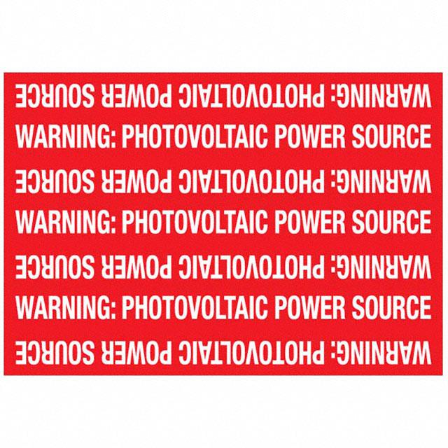 This is manufactured by HellermannTyton. The manufacturer part number is 596-00208. Its text message shows warning:photovoltaic power source . The product is available in self adhesive configuration. It has a decent red, white colour. The product is made from highly stable and reliable vinyl. In addition, the height is 127 mm. Furthermore, the product is 184.15mm wide. It contains 25 item per package . However, its text language is english . It is rated with ifc, nec, ul. Applications Information- safety: warning. It is assigned with possible HTSUS value of 3926.90.9985. The product is rohs3 compliant. The symbol only legend includes - no symbol. Arrangement configuration includes - text only. Furthermore, the product is 7.250" (184.15mm) wide. Location Information - outdoor. The background colour is red. It is a rectangle product with unique specifications. The product is widely employed in solar. In addition, it is reach unaffected. It is pre-printed, printable (thermal transfer). Language include - english. It is shipped in bulk package . Its typical moisture sensitivity level is 1 (unlimited). Its accurate length is 5.000" (127.00mm). While text on legend is - warning : photovoltaic power source. It has a long 4 weeks standard lead time. The splendid features of the product include reflective, uv resistant, weather resistant. The product is available in adhesive configuration. The product's body is manufactured from highly durable vinyl materials. The legend is white. Moreover, it corresponds to 596-00, a base product number of the product. The product is designated with the ear99 code number.