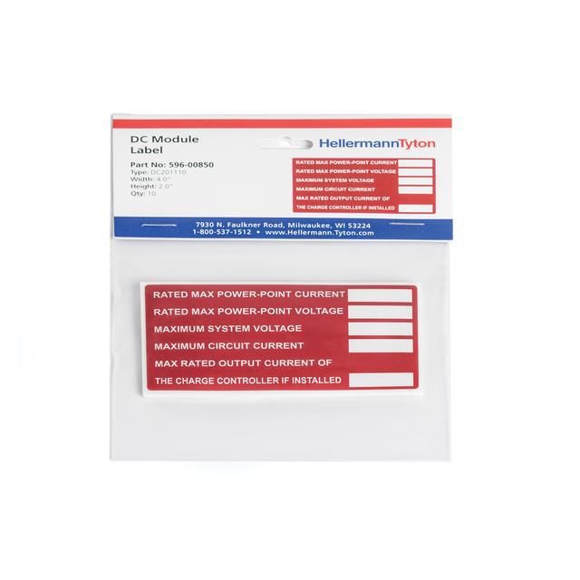 This is manufactured by HellermannTyton. The manufacturer part number is 596-00850. It is rated with ifc, nec, ul rated. Applications Information- notice. It is assigned with possible HTSUS value of 3926.90.9985. The product is rohs compliant. The symbol only legend includes - no symbol. Arrangement configuration includes - text only. Furthermore, the product is 4.000" (101.60mm) wide. The background colour is red. It is a rectangle product with unique specifications. The product is widely employed in solar. It is pre-printed, printable (thermal transfer). Language include - english. Its typical moisture sensitivity level is 1 (unlimited). Its accurate length is 2.000" (50.80mm). While text on legend is - rated max power point current. rated max power point current. maximum system voltage. maximum circuit current. max rated ou.... It has a long 5 weeks standard lead time. The splendid features of the product include uv resistant, weather resistant. The product is available in adhesive configuration. The product's body is manufactured from highly durable polyester materials. The legend is white. Moreover, it corresponds to 596-00, a base product number of the product. The product is designated with the ear99 code number.