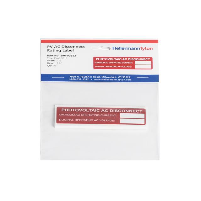 This is manufactured by HellermannTyton. The manufacturer part number is 596-00852. It is rated with ifc, nec, ul rated. Applications Information- safety. It is assigned with possible HTSUS value of 3926.90.9989. The product is rohs compliant. The symbol only legend includes - no symbol. Arrangement configuration includes - text only. Furthermore, the product is 1.000" (25.40mm) wide. The background colour is red. The product is widely employed in solar. The hellermanntyton's product offers user-desired applications. It is pre-printed, printable (thermal transfer). Language include - english. Its typical moisture sensitivity level is 1 (unlimited). Its accurate length is 3.750" (95.25mm). It has a long 5 weeks standard lead time. The splendid features of the product include uv resistant, weather resistant. The product is available in adhesive configuration. The product's body is manufactured from highly durable polyester materials. The legend is white. In addition, bulk is the available packaging type of the product. It is a rectangle product with unique specifications. Moreover, it corresponds to 596-00, a base product number of the product. The product is designated with the ear99 code number.