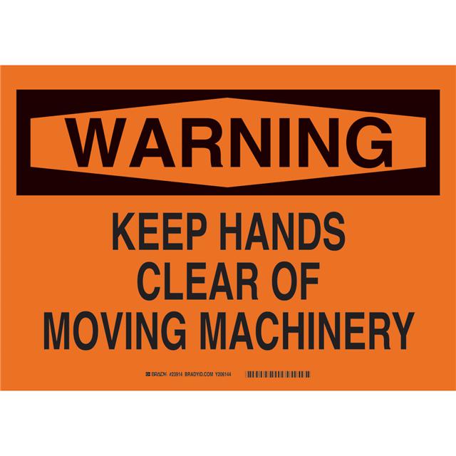 This is manufactured by Brady Corporation. The manufacturer part number is 23914. Applications Information- safety: warning. It is assigned with possible HTSUS value of 3919.90.5060. The product is not applicable. The symbol only legend includes - no symbol. Arrangement configuration includes - text only. Furthermore, the product is 10.000" (254.00mm) wide. Location Information - outdoor. The background colour is orange. It is a rectangle product with unique specifications. The product is widely employed in facility. In addition, it is reach unaffected. It is pre-printed. Language include - english. It is shipped in bulk package . Its typical moisture sensitivity level is not applicable. Its accurate length is 14.000" (355.60mm). While text on legend is - warning. keep hands clear of moving machinery. The splendid features of the product include abrasion resistant, chemical resistant. The product is available in adhesive configuration. The product's body is manufactured from highly durable vinyl materials. The product brady®, is a highly preferred choice for users. The legend is black. The product is designated with the ear99 code number.