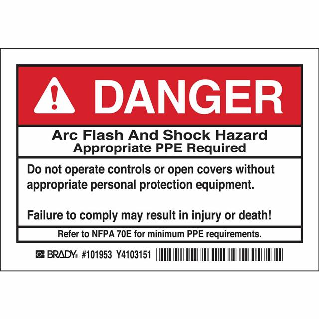 This is manufactured by Brady Corporation. The manufacturer part number is 101953. Applications Information- notice. It is assigned with possible HTSUS value of 3919.90.5060. The product is rohs3 compliant. The symbol only legend includes - warning. Arrangement configuration includes - symbol and text. Furthermore, the product is 3.500" (88.90mm) wide. Location Information - outdoor. The background colour is white. In addition, it is reach unaffected. The product is widely employed in facility. The brady corporation's product offers user-desired applications. It is pre-printed. Language include - english. Its typical moisture sensitivity level is not applicable. Its accurate length is 5.000" (127.00mm). While text on legend is - danger. arc flash and shock hazard appropriate ppe required do not operate controls or open covers without appropriate perso.... It has a long 4 weeks standard lead time. The splendid features of the product include abrasion resistant, chemical resistant. The product is available in adhesive configuration. The product's body is manufactured from highly durable polyester (pet) materials. The product brady®, is a highly preferred choice for users. The legend is black, red. In addition, bulk is the available packaging type of the product. It is a rectangle product with unique specifications. The product is designated with the ear99 code number.