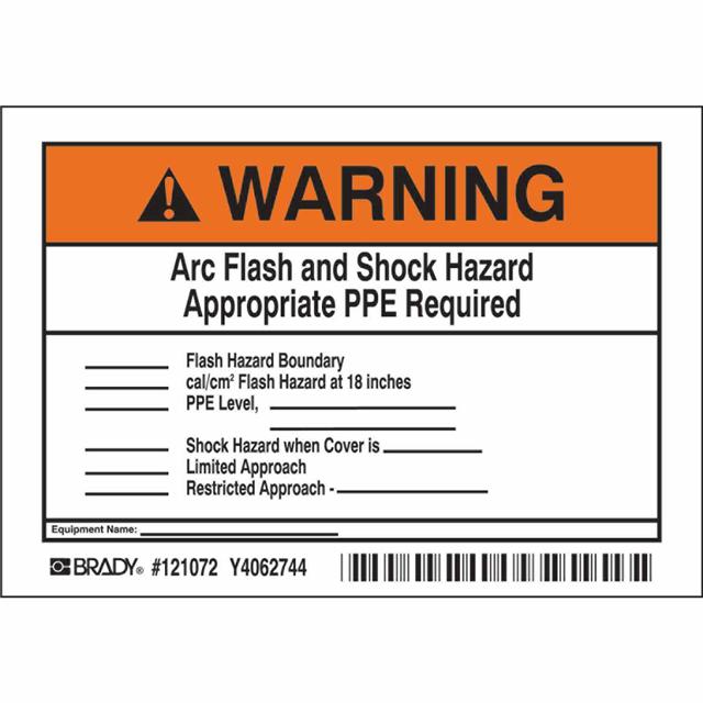 This is manufactured by Brady Corporation. The manufacturer part number is 121072. Applications Information- safety: warning. It is assigned with possible HTSUS value of 3919.90.5060. The product is rohs3 compliant. The symbol only legend includes - warning. Arrangement configuration includes - symbol and text. Furthermore, the product is 3.500" (88.90mm) wide. Location Information - outdoor. The background colour is white. In addition, it is reach unaffected. The product is widely employed in facility. The brady corporation's product offers user-desired applications. It is pre-printed. Language include - english. Its typical moisture sensitivity level is not applicable. Its accurate length is 5.000" (127.00mm). While text on legend is - warning. arc flash and shock hazard appropriate ppe required. flash hazard boundary. cal/cm2 flash hazard at 18 inches. It has a long 4 weeks standard lead time. The splendid features of the product include abrasion resistant, chemical resistant. The product is available in adhesive configuration. The product's body is manufactured from highly durable vinyl materials. The product brady®, is a highly preferred choice for users. The legend is black, orange. In addition, bulk is the available packaging type of the product. It is a rectangle product with unique specifications. The product is designated with the ear99 code number.
