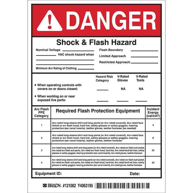 This is manufactured by Brady Corporation. The manufacturer part number is 121082. Applications Information- safety: danger. It is assigned with possible HTSUS value of 3919.90.5060. The product is rohs3 compliant. The symbol only legend includes - warning. Arrangement configuration includes - symbol and text. Furthermore, the product is 5.000" (127.00mm) wide. Location Information - outdoor. The background colour is white. In addition, it is reach unaffected. The product is widely employed in facility. The brady corporation's product offers user-desired applications. It is pre-printed. Language include - english. Its typical moisture sensitivity level is not applicable. Its accurate length is 7.000" (177.80mm). While text on legend is - danger. shock. flash hazard nominal system voltage. vac shock hazard when.. It has a long 4 weeks standard lead time. The splendid features of the product include abrasion resistant, chemical resistant. The product is available in adhesive configuration. The product's body is manufactured from highly durable vinyl materials. The product brady®, is a highly preferred choice for users. The legend is black, red. In addition, bulk is the available packaging type of the product. It is a rectangle product with unique specifications. The product is designated with the ear99 code number.