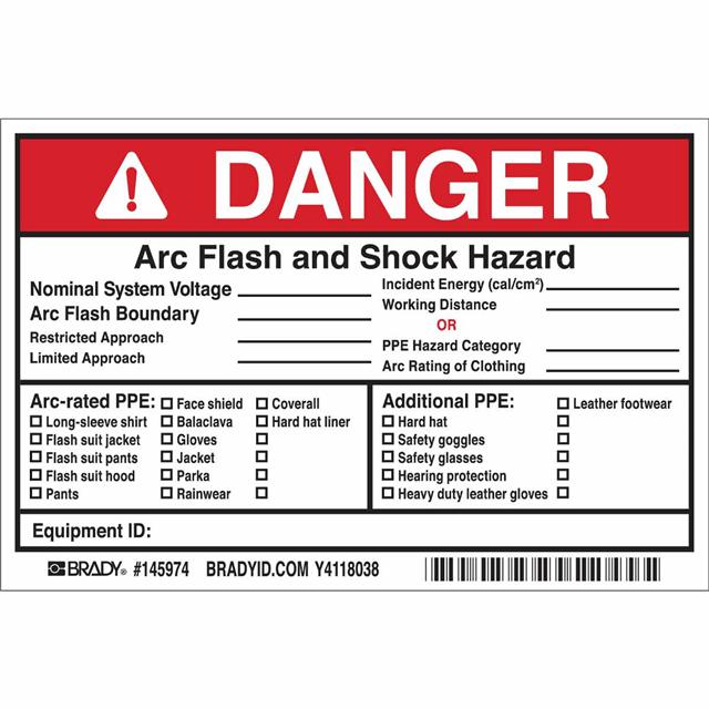 This is manufactured by Brady Corporation. The manufacturer part number is 145974. Applications Information- safety: danger. It is assigned with possible HTSUS value of 3919.90.5060. The product is rohs3 compliant. The symbol only legend includes - warning. Arrangement configuration includes - symbol and text. Furthermore, the product is 4.000" (101.60mm) wide. Location Information - outdoor. The background colour is white. In addition, it is reach unaffected. The product is widely employed in facility. The brady corporation's product offers user-desired applications. It is pre-printed. Language include - english. Its typical moisture sensitivity level is not applicable. Its accurate length is 6.000" (152.40mm). While text on legend is - danger. arc flash and shock hazard/nominal system voltage/arc flash boundary/restricted approach/limited approach. It has a long 4 weeks standard lead time. The splendid features of the product include abrasion resistant, chemical resistant. The product is available in adhesive configuration. The product's body is manufactured from highly durable vinyl materials. The product brady®, is a highly preferred choice for users. The legend is black, red. In addition, bulk is the available packaging type of the product. It is a rectangle product with unique specifications. The product is designated with the ear99 code number.