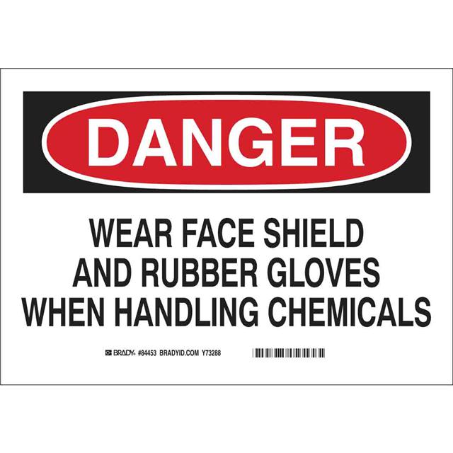 This is manufactured by Brady Corporation. The manufacturer part number is 84453. Applications Information- notice. It is assigned with possible HTSUS value of 4911.99.8000. The product is rohs3 compliant. The symbol only legend includes - no symbol. Arrangement configuration includes - text only. Furthermore, the product is 7.000" (177.80mm) wide. Location Information - outdoor. The background colour is white. It is a rectangle product with unique specifications. The product is widely employed in facility. In addition, it is reach unaffected. It is pre-printed. Language include - english. It is shipped in bulk package . Its typical moisture sensitivity level is not applicable. Its accurate length is 10.000" (254.00mm). While text on legend is - danger. wear face shield and rubber gloves when handling chemicals. It has a long 4 weeks standard lead time. The splendid features of the product include abrasion resistant, chemical resistant. The product is available in adhesive configuration. The product's body is manufactured from highly durable polyester (pet) materials. The product brady®, is a highly preferred choice for users. The legend is black, red. The product is designated with the ear99 code number.