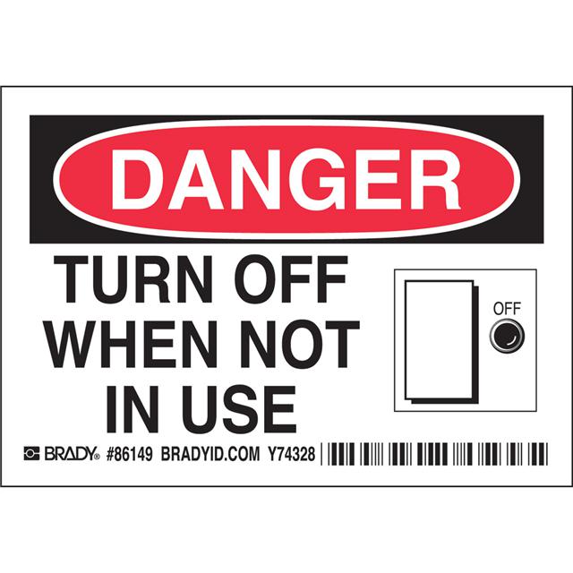 This is manufactured by Brady Corporation. The manufacturer part number is 86149. Applications Information- notice. It is assigned with possible HTSUS value of 3919.90.5060. The product is rohs3 compliant. The symbol only legend includes - see legend (text). Arrangement configuration includes - symbol and text. Furthermore, the product is 3.500" (88.90mm) wide. Location Information - outdoor. The background colour is white. In addition, it is reach unaffected. The product is widely employed in facility. The brady corporation's product offers user-desired applications. It is pre-printed. Language include - english. Its typical moisture sensitivity level is not applicable. Its accurate length is 5.000" (127.00mm). While text on legend is - danger. turn off when not in use. It has a long 4 weeks standard lead time. The splendid features of the product include abrasion resistant, chemical resistant. The product is available in adhesive configuration. The product's body is manufactured from highly durable polyester (pet) materials. The product brady®, is a highly preferred choice for users. The legend is black, red. In addition, bulk is the available packaging type of the product. It is a rectangle product with unique specifications. The product is designated with the ear99 code number.
