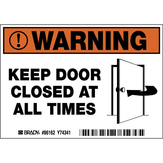 This is manufactured by Brady Corporation. The manufacturer part number is 86162. Applications Information- safety: warning. It is assigned with possible HTSUS value of 3919.90.5060. The product is rohs3 compliant. The symbol only legend includes - see legend (text). Arrangement configuration includes - symbol and text. Furthermore, the product is 3.500" (88.90mm) wide. Location Information - outdoor. The background colour is white. In addition, it is reach unaffected. The product is widely employed in facility. The brady corporation's product offers user-desired applications. It is pre-printed. Language include - english. Its typical moisture sensitivity level is not applicable. Its accurate length is 5.000" (127.00mm). While text on legend is - warning. keep door closed at all times. It has a long 4 weeks standard lead time. The splendid features of the product include abrasion resistant, chemical resistant. The product is available in adhesive configuration. The product's body is manufactured from highly durable polyester (pet) materials. The product brady®, is a highly preferred choice for users. The legend is black, orange. In addition, bulk is the available packaging type of the product. It is a rectangle product with unique specifications. The product is designated with the ear99 code number.