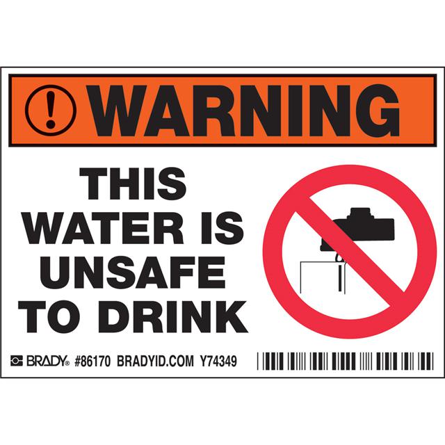 This is manufactured by Brady Corporation. The manufacturer part number is 86170. Applications Information- notice. It is assigned with possible HTSUS value of 3919.90.5060. The product is rohs3 compliant. The symbol only legend includes - see legend (text). Arrangement configuration includes - symbol and text. Furthermore, the product is 3.500" (88.90mm) wide. Location Information - outdoor. The background colour is white. It is a rectangle product with unique specifications. The product is widely employed in facility. In addition, it is reach unaffected. It is pre-printed. Language include - english. It is shipped in bulk package . Its typical moisture sensitivity level is not applicable. Its accurate length is 5.000" (127.00mm). While text on legend is - warning. this water is unsafe to drink. It has a long 4 weeks standard lead time. The splendid features of the product include abrasion resistant, chemical resistant. The product is available in adhesive configuration. The product's body is manufactured from highly durable polyester (pet) materials. The product brady®, is a highly preferred choice for users. The legend is black, orange, red. The product is designated with the ear99 code number.