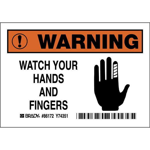 This is manufactured by Brady Corporation. The manufacturer part number is 86172. Applications Information- notice. It is assigned with possible HTSUS value of 3919.90.5060. The product is rohs3 compliant. The symbol only legend includes - see legend (text). Arrangement configuration includes - symbol and text. Furthermore, the product is 3.500" (88.90mm) wide. Location Information - outdoor. The background colour is white. It is a rectangle product with unique specifications. The product is widely employed in facility. In addition, it is reach unaffected. It is pre-printed. Language include - english. It is shipped in bulk package . Its typical moisture sensitivity level is not applicable. Its accurate length is 5.000" (127.00mm). While text on legend is - warning. watch your hands and fingers. It has a long 4 weeks standard lead time. The splendid features of the product include abrasion resistant, chemical resistant. The product is available in adhesive configuration. The product's body is manufactured from highly durable polyester (pet) materials. The product brady®, is a highly preferred choice for users. The legend is black, orange. The product is designated with the ear99 code number.