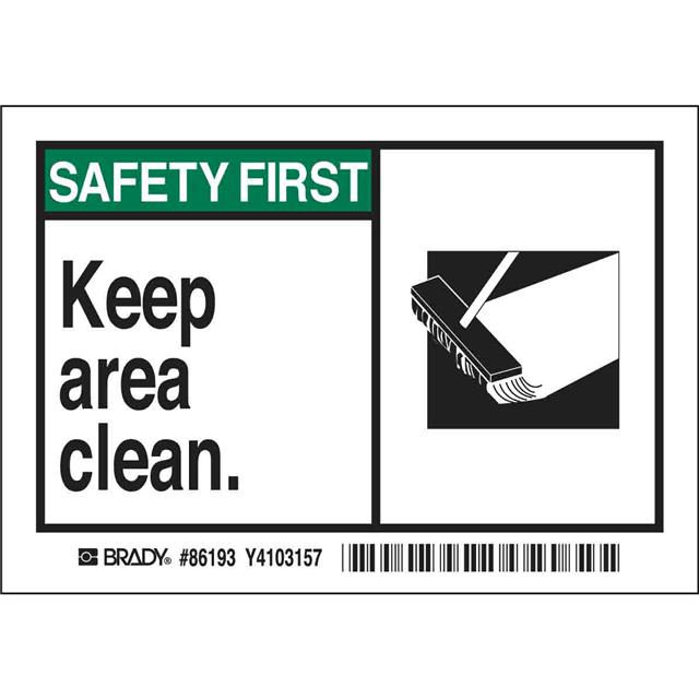 This is manufactured by Brady Corporation. The manufacturer part number is 86193. Applications Information- safety. It is assigned with possible HTSUS value of 3919.90.5060. The product is rohs3 compliant. The symbol only legend includes - see legend (text). Arrangement configuration includes - symbol and text. Furthermore, the product is 3.500" (88.90mm) wide. Location Information - outdoor. The background colour is white. It is a rectangle product with unique specifications. The product is widely employed in facility. In addition, it is reach unaffected. It is pre-printed. Language include - english. It is shipped in bulk package . Its typical moisture sensitivity level is not applicable. Its accurate length is 5.000" (127.00mm). While text on legend is - safety first. keep area clean. It has a long 4 weeks standard lead time. The splendid features of the product include abrasion resistant, chemical resistant. The product is available in adhesive configuration. The product's body is manufactured from highly durable polyester (pet) materials. The product brady®, is a highly preferred choice for users. The legend is black, green. The product is designated with the ear99 code number.