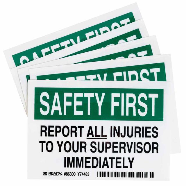 This is manufactured by Brady Corporation. The manufacturer part number is 86300. Applications Information- safety. It is assigned with possible HTSUS value of 3919.90.5060. The product is rohs3 compliant. The symbol only legend includes - no symbol. Arrangement configuration includes - text only. Furthermore, the product is 3.500" (88.90mm) wide. Location Information - outdoor. The background colour is white. It is a rectangle product with unique specifications. The product is widely employed in facility. In addition, it is reach unaffected. It is pre-printed. Language include - english. It is shipped in bulk package . Its typical moisture sensitivity level is not applicable. Its accurate length is 5.000" (127.00mm). While text on legend is - safety first. report all injuries to your supervisor immediately. It has a long 4 weeks standard lead time. The splendid features of the product include abrasion resistant, chemical resistant. The product is available in adhesive configuration. The product's body is manufactured from highly durable polyester (pet) materials. The product brady®, is a highly preferred choice for users. The legend is black, green. The product is designated with the ear99 code number.