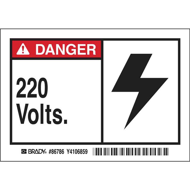 This is manufactured by Brady Corporation. The manufacturer part number is 86786. Applications Information- safety: danger. It is assigned with possible HTSUS value of 3919.90.5060. The product is rohs3 compliant. The symbol only legend includes - electric voltage. Arrangement configuration includes - symbol and text. Furthermore, the product is 3.500" (88.90mm) wide. Location Information - outdoor. The background colour is white. It is a rectangle product with unique specifications. The product is widely employed in general. In addition, it is reach unaffected. It is pre-printed. Language include - english. It is shipped in bulk package . Its typical moisture sensitivity level is not applicable. Its accurate length is 5.000" (127.00mm). While text on legend is - danger. 220 volts. It has a long 4 weeks standard lead time. The splendid features of the product include abrasion resistant, chemical resistant. The product is available in adhesive configuration. The product's body is manufactured from highly durable polyester (pet) materials. The product brady®, is a highly preferred choice for users. The legend is black, red. The product is designated with the ear99 code number.