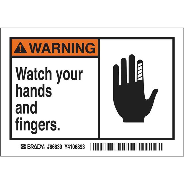 This is manufactured by Brady Corporation. The manufacturer part number is 86839. Applications Information- safety: warning. It is assigned with possible HTSUS value of 3919.90.5060. The product is rohs3 compliant. The symbol only legend includes - see legend (text). Arrangement configuration includes - symbol and text. Furthermore, the product is 3.500" (88.90mm) wide. Location Information - outdoor. The background colour is white. It is a rectangle product with unique specifications. The product is widely employed in facility. In addition, it is reach unaffected. It is pre-printed. Language include - english. It is shipped in bulk package . Its typical moisture sensitivity level is not applicable. Its accurate length is 5.000" (127.00mm). While text on legend is - warning. watch your hands and fingers.. It has a long 4 weeks standard lead time. The splendid features of the product include abrasion resistant, chemical resistant. The product is available in adhesive configuration. The product's body is manufactured from highly durable polyester (pet) materials. The product brady®, is a highly preferred choice for users. The legend is black, orange. The product is designated with the ear99 code number.