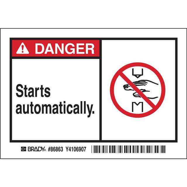 This is manufactured by Brady Corporation. The manufacturer part number is 86863. Applications Information- safety: danger. It is assigned with possible HTSUS value of 3919.90.5060. The product is rohs3 compliant. The symbol only legend includes - safety function. Arrangement configuration includes - symbol and text. Furthermore, the product is 3.500" (88.90mm) wide. Location Information - outdoor. The background colour is white. It is a rectangle product with unique specifications. The product is widely employed in facility. In addition, it is reach unaffected. It is pre-printed. Language include - english. It is shipped in bulk package . Its typical moisture sensitivity level is not applicable. Its accurate length is 5.000" (127.00mm). While text on legend is - danger. starts automatically.. It has a long 4 weeks standard lead time. The splendid features of the product include abrasion resistant, chemical resistant. The product is available in adhesive configuration. The product's body is manufactured from highly durable polyester (pet) materials. The product brady®, is a highly preferred choice for users. The legend is black, red. The product is designated with the ear99 code number.