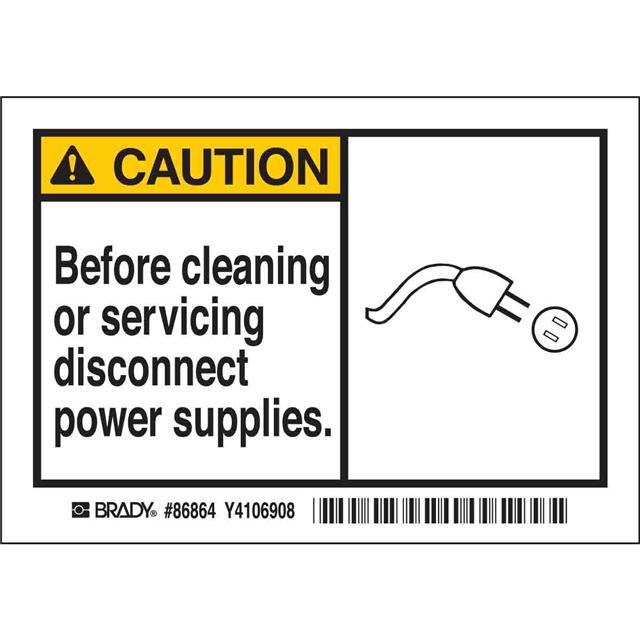 This is manufactured by Brady Corporation. The manufacturer part number is 86864. Applications Information- safety: caution. It is assigned with possible HTSUS value of 3919.90.5060. The product is rohs3 compliant. The symbol only legend includes - disconnect power. Arrangement configuration includes - symbol and text. Furthermore, the product is 3.500" (88.90mm) wide. Location Information - outdoor. The background colour is white. It is a rectangle product with unique specifications. The product is widely employed in facility. In addition, it is reach unaffected. It is pre-printed. Language include - english. It is shipped in bulk package . Its typical moisture sensitivity level is not applicable. Its accurate length is 5.000" (127.00mm). While text on legend is - caution. before cleaning or servicing disconnect power supplies.. It has a long 4 weeks standard lead time. The splendid features of the product include abrasion resistant, chemical resistant. The product is available in adhesive configuration. The product's body is manufactured from highly durable polyester (pet) materials. The product brady®, is a highly preferred choice for users. The legend is black, yellow. The product is designated with the ear99 code number.