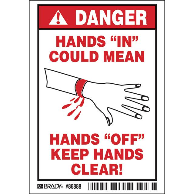 This is manufactured by Brady Corporation. The manufacturer part number is 86888. Applications Information- alpha/numeric. It is assigned with possible HTSUS value of 4911.99.8000. The product is rohs3 compliant. The symbol only legend includes - see legend (text). Arrangement configuration includes - symbol and text. Furthermore, the product is 3.500" (88.90mm) wide. Location Information - outdoor. The background colour is white. It is a rectangle product with unique specifications. The product is widely employed in facility. In addition, it is reach unaffected. It is pre-printed. Language include - english. It is shipped in bulk package . Its typical moisture sensitivity level is not applicable. Its accurate length is 5.000" (127.00mm). While text on legend is - danger. hands "in". It has a long 4 weeks standard lead time. The splendid features of the product include abrasion resistant, chemical resistant. The product is available in adhesive configuration. The product's body is manufactured from highly durable polyester (pet) materials. The product brady®, is a highly preferred choice for users. The legend is black, red. The product is designated with the ear99 code number.