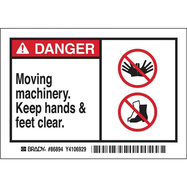 This is manufactured by Brady Corporation. The manufacturer part number is 86894. Applications Information- notice. It is assigned with possible HTSUS value of 3919.90.5060. The product is rohs3 compliant. The symbol only legend includes - safety function. Arrangement configuration includes - symbol and text. Furthermore, the product is 3.500" (88.90mm) wide. Location Information - outdoor. The background colour is white. It is a rectangle product with unique specifications. The product is widely employed in facility. In addition, it is reach unaffected. It is pre-printed. Language include - english. It is shipped in bulk package . Its typical moisture sensitivity level is not applicable. Its accurate length is 5.000" (127.00mm). While text on legend is - danger. moving machinery keep hands and feet clear. It has a long 4 weeks standard lead time. The splendid features of the product include abrasion resistant, chemical resistant. The product is available in adhesive configuration. The product's body is manufactured from highly durable polyester (pet) materials. The product brady®, is a highly preferred choice for users. The legend is black, red. The product is designated with the ear99 code number.