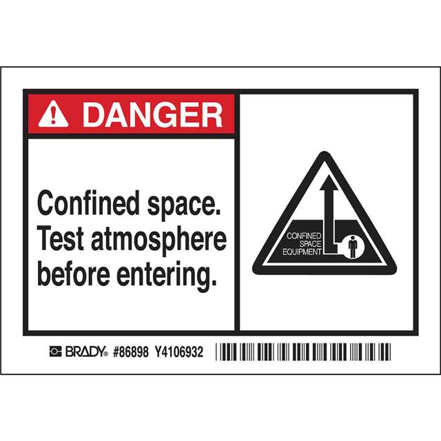 This is manufactured by Brady Corporation. The manufacturer part number is 86898. Applications Information- safety: danger. It is assigned with possible HTSUS value of 4911.99.8000. The product is rohs3 compliant. The symbol only legend includes - see legend (text). Arrangement configuration includes - symbol and text. Furthermore, the product is 3.500" (88.90mm) wide. Location Information - outdoor. The background colour is white. It is a rectangle product with unique specifications. The product is widely employed in facility. In addition, it is reach unaffected. It is pre-printed. Language include - english. It is shipped in bulk package . Its typical moisture sensitivity level is not applicable. Its accurate length is 5.000" (127.00mm). While text on legend is - danger. confined space. test atmosphere before entering.. It has a long 4 weeks standard lead time. The splendid features of the product include abrasion resistant, chemical resistant. The product is available in adhesive configuration. The product's body is manufactured from highly durable polyester (pet) materials. The product brady®, is a highly preferred choice for users. The legend is black, red. The product is designated with the ear99 code number.