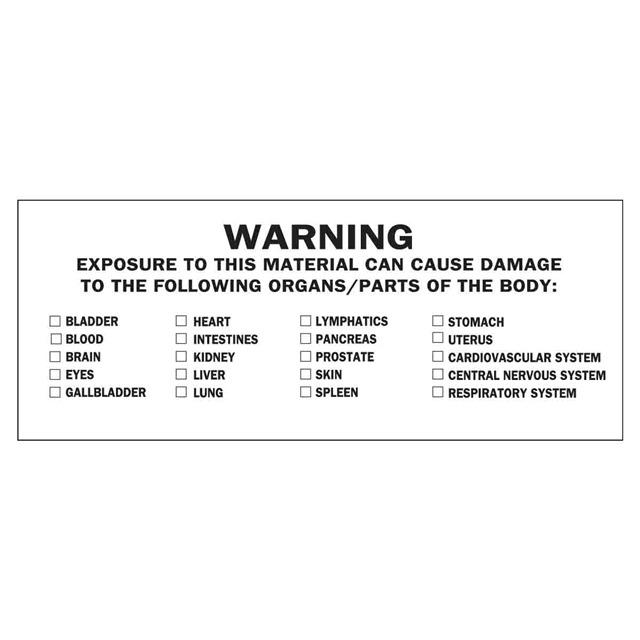 This is manufactured by Brady Corporation. The manufacturer part number is 93800. Applications Information- notice. It is assigned with possible HTSUS value of 3919.90.5060. The product is rohs3 compliant. The symbol only legend includes - no symbol. Arrangement configuration includes - text only. Furthermore, the product is 1.500" (38.10mm) 1 1/2" wide. Location Information - outdoor. The background colour is white. In addition, it is reach unaffected. The product is widely employed in facility. The brady corporation's product offers user-desired applications. It is pre-printed. Language include - english. Its typical moisture sensitivity level is not applicable. Its accurate length is 4.000" (101.60mm). While text on legend is - warning. exposure to this material can cause damage to the following organs/parts of body.. It has a long 4 weeks standard lead time. The splendid features of the product include abrasion resistant, chemical resistant. The product is available in adhesive configuration. The product's body is manufactured from highly durable vinyl materials. The product brady®, is a highly preferred choice for users. The legend is black. In addition, bulk is the available packaging type of the product. It is a rectangle product with unique specifications. The product is designated with the ear99 code number.