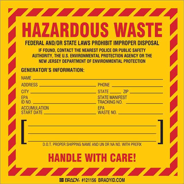 This is manufactured by Brady Corporation. The manufacturer part number is 121156. Applications Information- safety: hazard. It is assigned with possible HTSUS value of 3919.90.5060. The product is rohs3 compliant. The symbol only legend includes - no symbol. Arrangement configuration includes - text only. Furthermore, the product is 6.000" (152.40mm) wide. Location Information - outdoor. The background colour is yellow. It is a square product with unique specifications. The product is widely employed in facility. In addition, it is reach unaffected. It is pre-printed. Language include - english. It is shipped in bulk package . Its typical moisture sensitivity level is not applicable. Its accurate length is 6.000" (152.40mm). While text on legend is - hazardous waste. federal and/or state laws prohibit improper disposal if found, contact the nearest police or public safety au…. It has a long 4 weeks standard lead time. The splendid features of the product include abrasion resistant, chemical resistant. The product is available in adhesive configuration. The product's body is manufactured from highly durable vinyl materials. The product brady®, is a highly preferred choice for users. The legend is black, red. The product is designated with the ear99 code number.