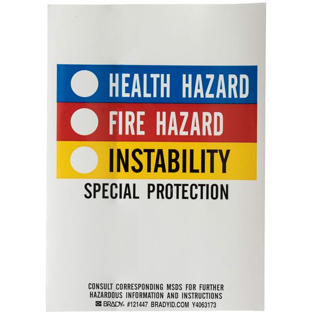 This is manufactured by Brady Corporation. The manufacturer part number is 121447. Applications Information- notice. It is assigned with possible HTSUS value of 3919.90.5060. The product is rohs3 compliant. The symbol only legend includes - no symbol. Arrangement configuration includes - text only. Furthermore, the product is 5.000" (127.00mm) wide. Location Information - outdoor. The background colour is white. It is a rectangle product with unique specifications. The product is widely employed in facility. In addition, it is reach unaffected. It is pre-printed. Language include - english. It is shipped in bulk package . Its typical moisture sensitivity level is not applicable. Its accurate length is 7.000" (177.80mm). While text on legend is - health hazard fire hazard instability special protection consult corresponding msds for further hazardous information and inst…. It has a long 4 weeks standard lead time. The splendid features of the product include abrasion resistant, chemical resistant. The product is available in adhesive configuration. The product's body is manufactured from highly durable vinyl materials. The product brady®, is a highly preferred choice for users. The legend is black, blue, red, yellow. The product is designated with the ear99 code number.