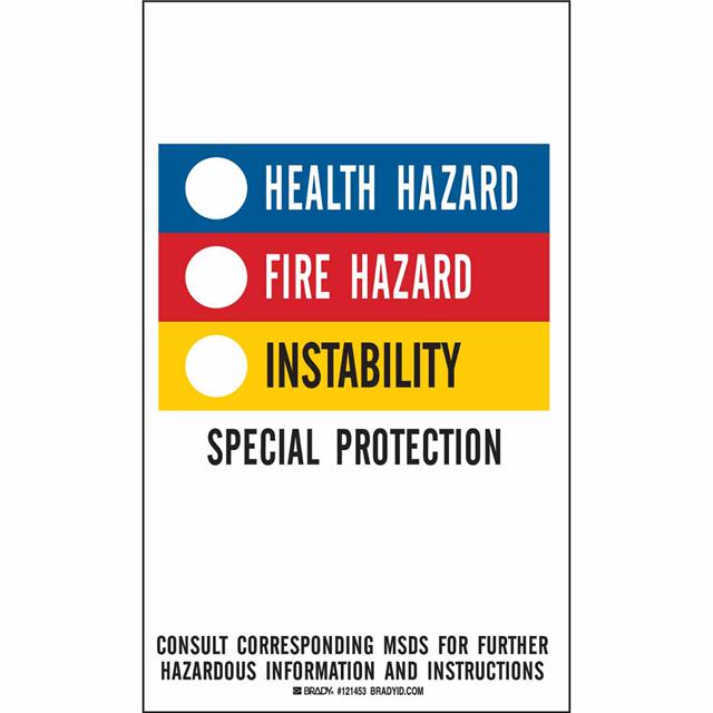This is manufactured by Brady Corporation. The manufacturer part number is 121453. Applications Information- safety. It is assigned with possible HTSUS value of 3919.90.5060. The product is rohs3 compliant. The symbol only legend includes - no symbol. Arrangement configuration includes - text only. Furthermore, the product is 3.000" (76.20mm) wide. Location Information - outdoor. The background colour is white. It is a rectangle product with unique specifications. The product is widely employed in general. In addition, it is reach unaffected. It is pre-printed. Language include - english. It is shipped in bulk package . Its typical moisture sensitivity level is not applicable. Its accurate length is 5.000" (127.00mm). While text on legend is - health hazard fire hazard instability special protection consult corresponding msds for further hazardous information and inst…. It has a long 4 weeks standard lead time. The splendid features of the product include abrasion resistant, chemical resistant. The product is available in adhesive, permanent configuration. The product's body is manufactured from highly durable vinyl materials. The product brady®, is a highly preferred choice for users. The legend is black, blue, red, yellow. The product is designated with the ear99 code number.