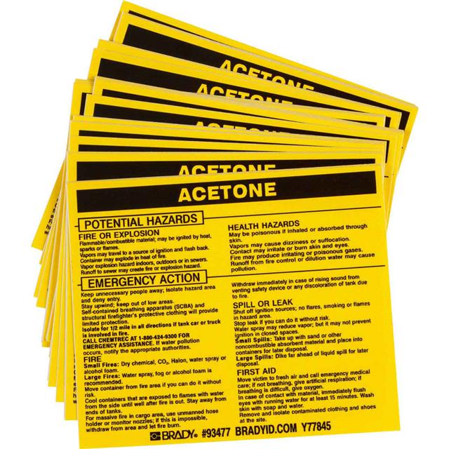 This is manufactured by Brady Corporation. The manufacturer part number is 93477. Applications Information- notice. It is assigned with possible HTSUS value of 3919.90.5060. The product is rohs3 compliant. The symbol only legend includes - no symbol. Arrangement configuration includes - text only. Furthermore, the product is 3.750" (95.25mm) wide. Location Information - outdoor. The background colour is yellow. It is a rectangle product with unique specifications. The product is widely employed in facility. In addition, it is reach unaffected. It is pre-printed. Language include - english. It is shipped in bulk package . Its typical moisture sensitivity level is not applicable. Its accurate length is 4.500" (114.30mm). While text on legend is - acetone. It has a long 4 weeks standard lead time. The splendid features of the product include abrasion resistant, chemical resistant. The product is available in adhesive configuration. The product's body is manufactured from highly durable vinyl materials. The product brady®, is a highly preferred choice for users. The legend is black. The product is designated with the ear99 code number.