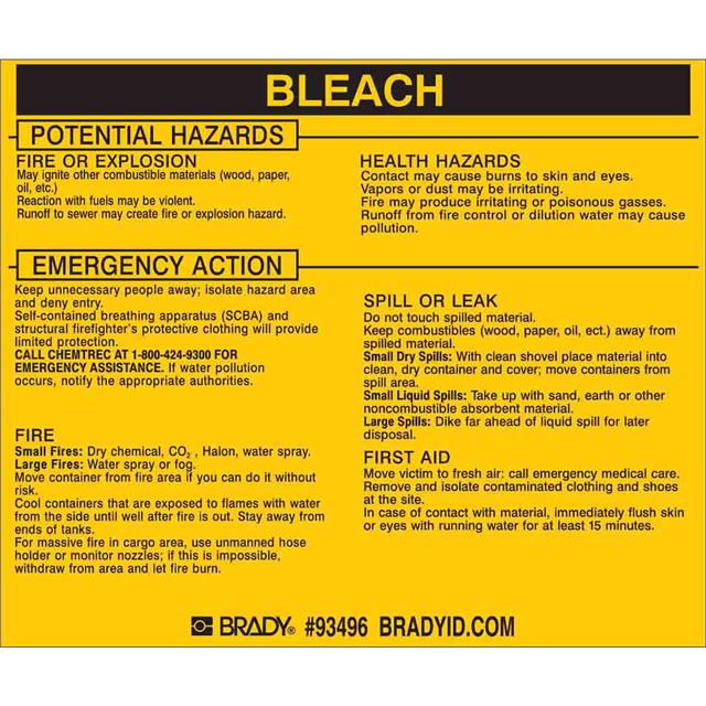 This is manufactured by Brady Corporation. The manufacturer part number is 93496. Applications Information- notice. It is assigned with possible HTSUS value of 3919.90.5060. The product is rohs3 compliant. The symbol only legend includes - no symbol. Arrangement configuration includes - text only. Furthermore, the product is 3.750" (95.25mm) wide. Location Information - outdoor. The background colour is yellow. It is a rectangle product with unique specifications. The product is widely employed in facility. In addition, it is reach unaffected. It is pre-printed. Language include - english. It is shipped in bulk package . Its typical moisture sensitivity level is not applicable. Its accurate length is 4.500" (114.30mm). While text on legend is - bleach. It has a long 4 weeks standard lead time. The splendid features of the product include abrasion resistant, chemical resistant. The product is available in adhesive configuration. The product's body is manufactured from highly durable vinyl materials. The product brady®, is a highly preferred choice for users. The legend is black. The product is designated with the ear99 code number.