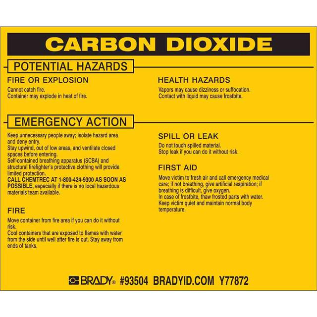 This is manufactured by Brady Corporation. The manufacturer part number is 93504. Applications Information- notice. It is assigned with possible HTSUS value of 3919.90.5060. The product is rohs3 compliant. The symbol only legend includes - no symbol. Arrangement configuration includes - text only. Furthermore, the product is 3.750" (95.25mm) wide. Location Information - outdoor. The background colour is yellow. It is a rectangle product with unique specifications. The product is widely employed in facility. In addition, it is reach unaffected. It is pre-printed. Language include - english. It is shipped in bulk package . Its typical moisture sensitivity level is not applicable. Its accurate length is 4.500" (114.30mm). While text on legend is - carbon dioxide. It has a long 4 weeks standard lead time. The splendid features of the product include abrasion resistant, chemical resistant. The product is available in adhesive configuration. The product's body is manufactured from highly durable vinyl materials. The product brady®, is a highly preferred choice for users. The legend is black. The product is designated with the ear99 code number.