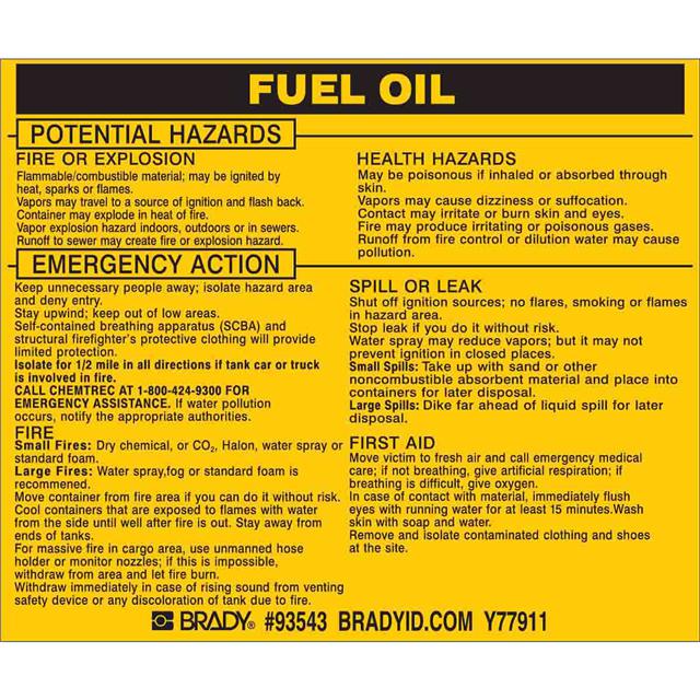 This is manufactured by Brady Corporation. The manufacturer part number is 93543. Applications Information- notice. It is assigned with possible HTSUS value of 3919.90.5060. The product is rohs3 compliant. The symbol only legend includes - no symbol. Arrangement configuration includes - text only. Furthermore, the product is 3.500" (88.90mm) wide. Location Information - outdoor. The background colour is yellow. It is a rectangle product with unique specifications. The product is widely employed in facility. In addition, it is reach unaffected. It is pre-printed. Language include - english. It is shipped in bulk package . Its typical moisture sensitivity level is not applicable. Its accurate length is 4.500" (114.30mm). While text on legend is - fuel oil. It has a long 4 weeks standard lead time. The splendid features of the product include abrasion resistant, chemical resistant. The product is available in adhesive configuration. The product's body is manufactured from highly durable vinyl materials. The product brady®, is a highly preferred choice for users. The legend is black. The product is designated with the ear99 code number.