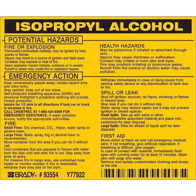 This is manufactured by Brady Corporation. The manufacturer part number is 93554. Applications Information- notice. It is assigned with possible HTSUS value of 3919.90.5060. The product is rohs3 compliant. The symbol only legend includes - no symbol. Arrangement configuration includes - text only. Furthermore, the product is 3.500" (88.90mm) wide. Location Information - outdoor. The background colour is yellow. It is a rectangle product with unique specifications. The product is widely employed in facility. In addition, it is reach unaffected. It is pre-printed. Language include - english. It is shipped in bulk package . Its typical moisture sensitivity level is not applicable. Its accurate length is 4.500" (114.30mm). While text on legend is - isopropyl alcohol. It has a long 4 weeks standard lead time. The splendid features of the product include abrasion resistant, chemical resistant. The product is available in adhesive configuration. The product's body is manufactured from highly durable vinyl materials. The product brady®, is a highly preferred choice for users. The legend is black. The product is designated with the ear99 code number.