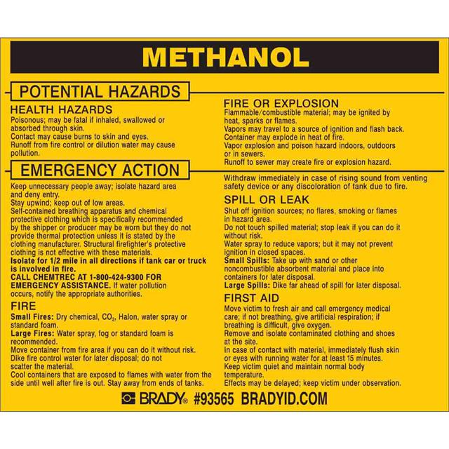 This is manufactured by Brady Corporation. The manufacturer part number is 93565. Applications Information- notice. It is assigned with possible HTSUS value of 3919.90.5060. The product is rohs3 compliant. The symbol only legend includes - no symbol. Arrangement configuration includes - text only. Furthermore, the product is 3.500" (88.90mm) wide. Location Information - outdoor. The background colour is yellow. In addition, it is reach unaffected. The product is widely employed in facility. The brady corporation's product offers user-desired applications. It is pre-printed. Language include - english. Its typical moisture sensitivity level is not applicable. Its accurate length is 4.500" (114.30mm). While text on legend is - methanol. It has a long 4 weeks standard lead time. The splendid features of the product include abrasion resistant, chemical resistant. The product is available in adhesive configuration. The product's body is manufactured from highly durable vinyl materials. The product brady®, is a highly preferred choice for users. The legend is black. In addition, bulk is the available packaging type of the product. It is a rectangle product with unique specifications. The product is designated with the ear99 code number.