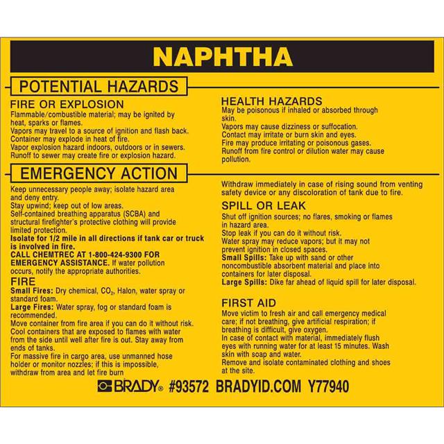 This is manufactured by Brady Corporation. The manufacturer part number is 93572. Applications Information- notice. It is assigned with possible HTSUS value of 3919.90.5060. The product is rohs3 compliant. The symbol only legend includes - no symbol. Arrangement configuration includes - text only. Furthermore, the product is 3.500" (88.90mm) wide. Location Information - outdoor. The background colour is yellow. It is a rectangle product with unique specifications. The product is widely employed in facility. In addition, it is reach unaffected. It is pre-printed. Language include - english. It is shipped in bulk package . Its typical moisture sensitivity level is not applicable. Its accurate length is 4.500" (114.30mm). While text on legend is - naphtha. It has a long 4 weeks standard lead time. The splendid features of the product include abrasion resistant, chemical resistant. The product is available in adhesive configuration. The product's body is manufactured from highly durable vinyl materials. The product brady®, is a highly preferred choice for users. The legend is black. The product is designated with the ear99 code number.
