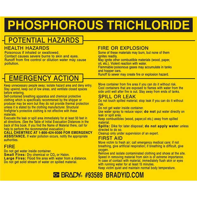 This is manufactured by Brady Corporation. The manufacturer part number is 93589. Applications Information- notice. It is assigned with possible HTSUS value of 3919.90.5060. The product is rohs3 compliant. The symbol only legend includes - no symbol. Arrangement configuration includes - text only. Furthermore, the product is 3.500" (88.90mm) wide. Location Information - outdoor. The background colour is yellow. In addition, it is reach unaffected. The product is widely employed in facility. The brady corporation's product offers user-desired applications. It is pre-printed. Language include - english. Its typical moisture sensitivity level is not applicable. Its accurate length is 4.500" (114.30mm). While text on legend is - phosphorous trichloride. It has a long 4 weeks standard lead time. The splendid features of the product include abrasion resistant, chemical resistant. The product is available in adhesive configuration. The product's body is manufactured from highly durable vinyl materials. The product brady®, is a highly preferred choice for users. The legend is black. In addition, bulk is the available packaging type of the product. It is a rectangle product with unique specifications. The product is designated with the ear99 code number.