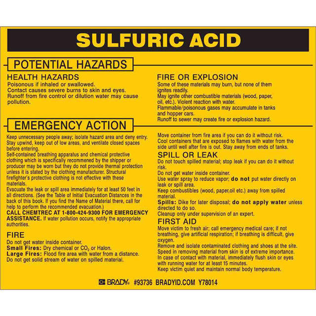 This is manufactured by Brady Corporation. The manufacturer part number is 93736. Applications Information- notice. It is assigned with possible HTSUS value of 3919.90.5060. The product is rohs3 compliant. The symbol only legend includes - no symbol. Arrangement configuration includes - text only. Furthermore, the product is 3.500" (88.90mm) wide. Location Information - outdoor. The background colour is yellow. In addition, it is reach unaffected. The product is widely employed in facility. The brady corporation's product offers user-desired applications. It is pre-printed. Language include - english. Its typical moisture sensitivity level is not applicable. Its accurate length is 4.500" (114.30mm). While text on legend is - sulfuric acid. It has a long 4 weeks standard lead time. The splendid features of the product include abrasion resistant, chemical resistant. The product is available in adhesive configuration. The product's body is manufactured from highly durable vinyl materials. The product brady®, is a highly preferred choice for users. The legend is black. In addition, bulk is the available packaging type of the product. It is a rectangle product with unique specifications. The product is designated with the ear99 code number.