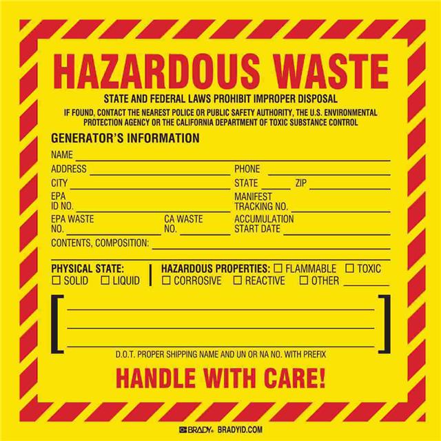 This is manufactured by Brady Corporation. The manufacturer part number is 121152. Applications Information- safety: hazard. It is assigned with possible HTSUS value of 3919.90.5060. The product is rohs3 compliant. The symbol only legend includes - no symbol. Arrangement configuration includes - text only. Furthermore, the product is 6.000" (152.40mm) wide. Location Information - outdoor. The background colour is yellow. It is a square product with unique specifications. The product is widely employed in facility. In addition, it is reach unaffected. It is pre-printed. Language include - english. It is shipped in bulk package . Its typical moisture sensitivity level is not applicable. Its accurate length is 6.000" (152.40mm). While text on legend is - hazardous waste. federal and/or state laws prohibit improper disposal if found, contact the nearest police or public safety au…. It has a long 4 weeks standard lead time. The splendid features of the product include abrasion resistant, chemical resistant. The product is available in adhesive configuration. The product's body is manufactured from highly durable vinyl materials. The product brady®, is a highly preferred choice for users. The legend is black, red. The product is designated with the ear99 code number.