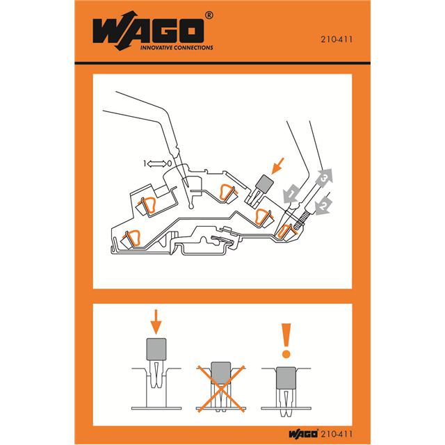 This is manufactured by WAGO Corporation. The manufacturer part number is 210-411. Applications Information- safety. It is assigned with possible HTSUS value of 3919.90.5060. The product is rohs3 compliant. The symbol only legend includes - safety function. Arrangement configuration includes - symbol only. The background colour is orange, white. The product is widely employed in industrial applications. The wago corporation's product offers user-desired applications. It is pre-printed. Its typical moisture sensitivity level is not applicable. It has a long 12 weeks standard lead time. The legend is black. In addition, box is the available packaging type of the product. The product is designated with the ear99 code number.