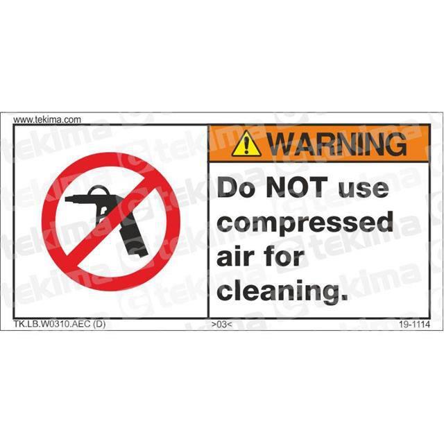This is manufactured by Tekima North America, Inc.. The manufacturer part number is TK.LB.W0310.AEC. It is rated with ansi, csa, ul rated. Applications Information- safety: warning. The background colour is orange, white. The product is rohs compliant. The symbol only legend includes - see legend (text). Arrangement configuration includes - symbol and text. The product's body is manufactured from highly durable vinyl laminated materials. Location Information - indoor/outdoor. It is a rectangle product with unique specifications. The product is widely employed in industrial applications. In addition, it is reach unaffected. It is pre-printed. Language include - english. It is shipped in retail package package . Its accurate length is 5.512" (140.00mm). While text on legend is - do not use compressed air for cleaning.. The splendid features of the product include uv resistant, weather resistant. The product is available in adhesive configuration. Furthermore, the product is 2.717" (69.00mm) wide. The legend is black, red, yellow.