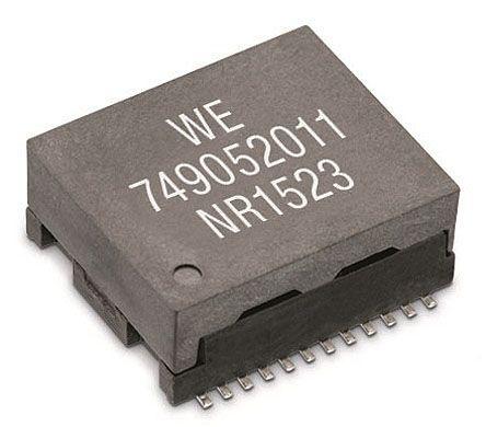 This is Surface Mount Lan Ethernet Transformer manufactured by Wurth Elektronik. The manufacturer part number is 749052011. Allows -1db of insertion loss. It has 1.5kv ac isolation voltage. The product complies with all safety standards, such as ieee 802.3, ieee 802.3af, ieee 802.3at, ul 94-v0. The product is available in surface mount configuration. The product has +70°c maximum temperature. While its minimum temperature is 0°c. It carries 100khz of maximum operating frequency. Moreover, it has 1 output ports . Furthermore, the product is 13.97mm wide. Its accurate length is 14.7mm. The product has been well-designed with enclosed construction. It has 1:1 turns ratio . The product is designed with a solder termination. Robust product with a ferrite core.